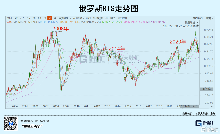 不过,俄罗斯股市整体表现与全球主流市场的步调一致。在2008年之前,俄罗斯股市迎来超级牛市。08年次贷危机,股市崩盘式暴跌,RTS指数从2000点左右快速下挫至500点,跌幅高达70%。