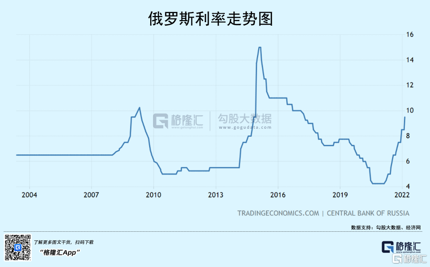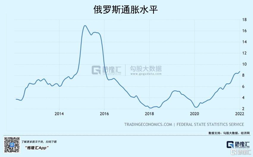去年开始,俄罗斯开启加息周期,一共加息7次至9.5%创下7年最高,加息幅度高达425个基点,成为主流央行中最为激进的。当然,这亦是为了遏制正在失控的通胀水平。2021年,俄罗斯通胀已经高达8.73%,比央行4%的目标高出一倍之多。