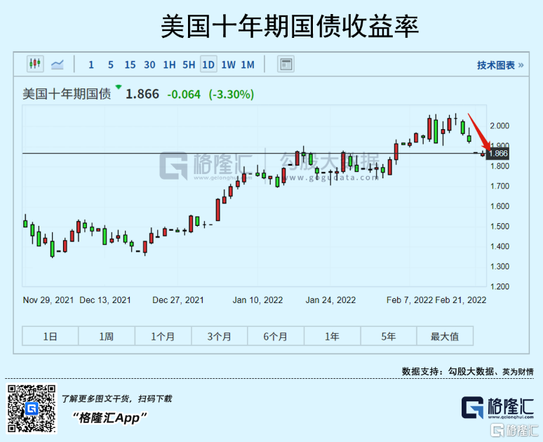 COMEX黄金再度升温,冲破1910美元大关。ICE布油更是大涨逾4%,突破97美元高位。同时,美债市场遭遇资金追捧,10年期美债收益率再度大跌3.3%,3日累跌9%,开始脱离整体2%的高压线。