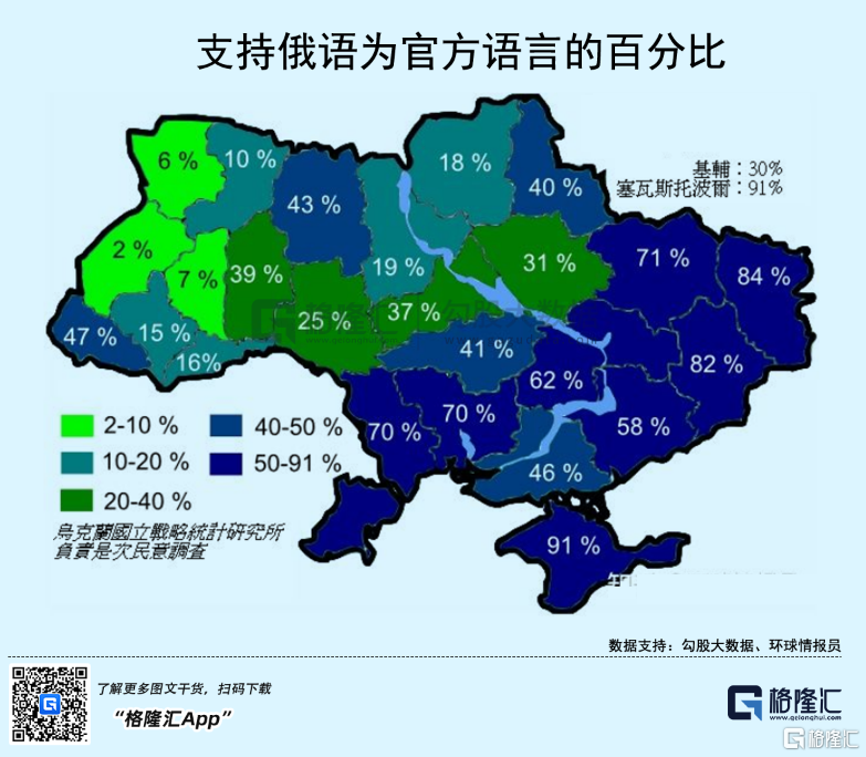 其实,俄乌合并300多年,两地早已是“你中有我,我中有你”的状态,乌克兰的俄罗斯族人口占比高达20%以上,尤其是克里米亚更是高达70%以上。在乌克兰,俄语长期是通行语言,东部顿巴斯地区使用俄语的比例高达70%以上,而乌克兰中部在反抗波兰统治时期形成了较为独立的乌克兰语。