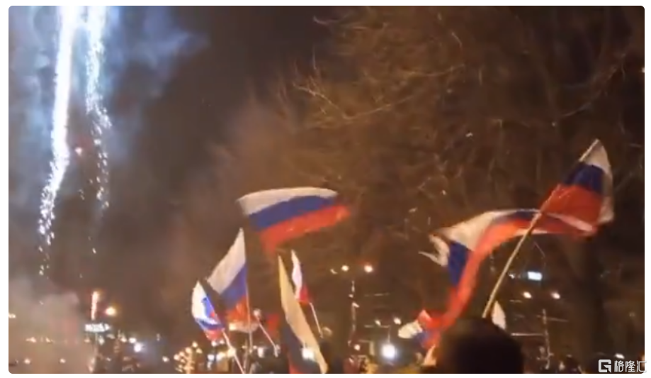 2月22日凌晨,普京宣布支持顿涅茨克、卢甘斯克两州独立。得知消息后,当地民众深夜走上街头,放烟花高举俄罗斯国旗庆祝。