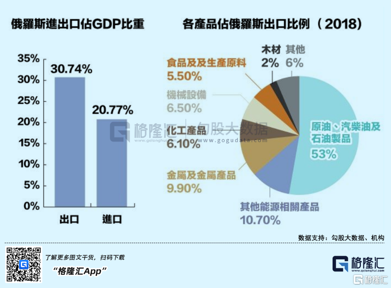 俄罗斯没有明星改革家,在苏联解体遭受打击之后,经济表现多年不温不火,产业越来越依赖能源出口。2018年的数据显示,出口占GDP的比重高达30.74%,进口占20.77%。其中,原油、汽柴油及石油制品占出口的53%,其他能源相关产品占据10.7%。
