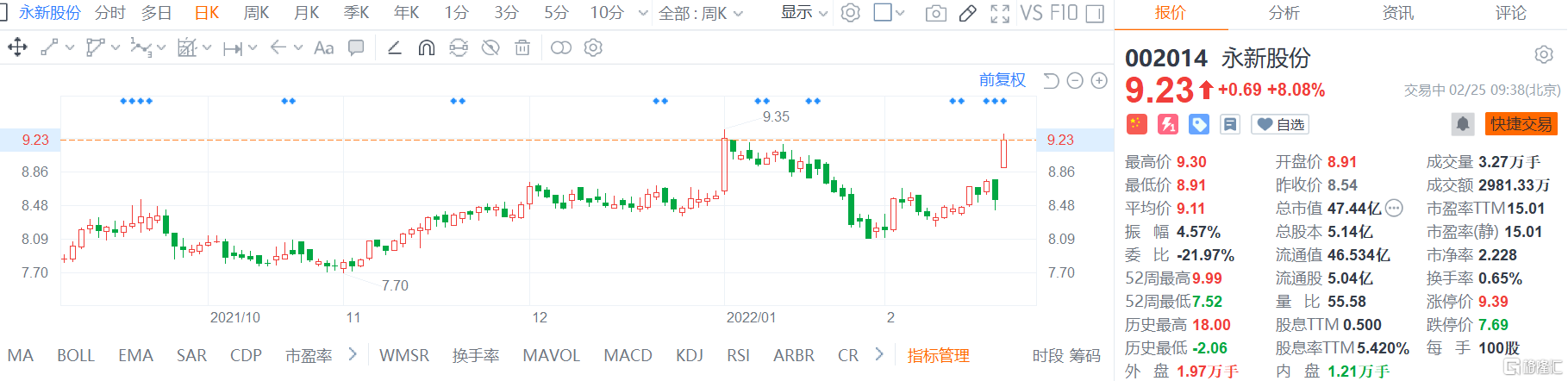 格隆汇2月25日丨永新股份(002014.SZ)高开高走,现报9.23元,创逾一个月新高,涨幅8.08%,总市值47.4亿。公司昨日披露2021年年度报告,营业收入30.24亿元,同比增长10.45%;归属于上市公司股东的净利润3.16亿元,同比增长4.25%;拟10派5元。此外,公司拟投资建设年产4000吨软包装材料生产线技术改造项目。