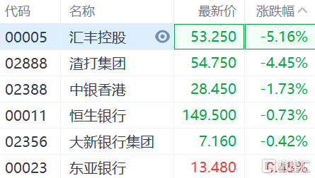 港股异动 | 香港银行股再度走弱,汇丰控股跌5%