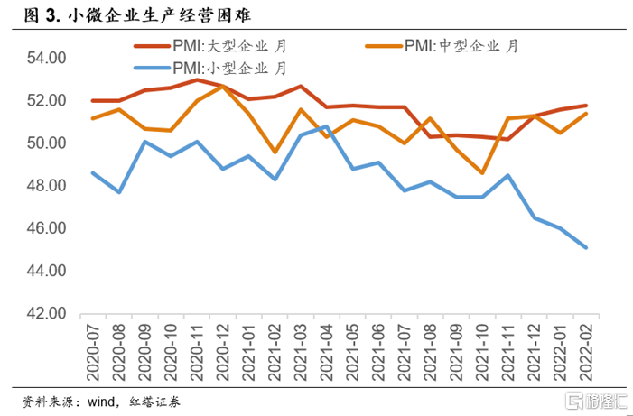 我们能够看到2月在主要原材料购进价格指标上,大、中、小企业分别上行3.2、2.9和5.4个百分点。同时,大、中型企业PMI分别为51.8%和51.4%,比上月上升0.2和0.9个百分点;而小型企业PMI比上月下降0.9个百分点,为45.1%。