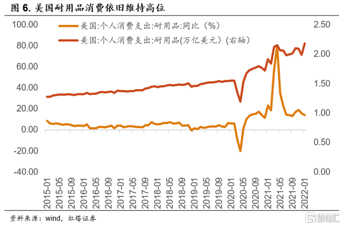 从数据上可以看到,2022年1月美国个人耐用品消费支出达到了2.2万亿美元,同比增长14%,依旧位于高位。