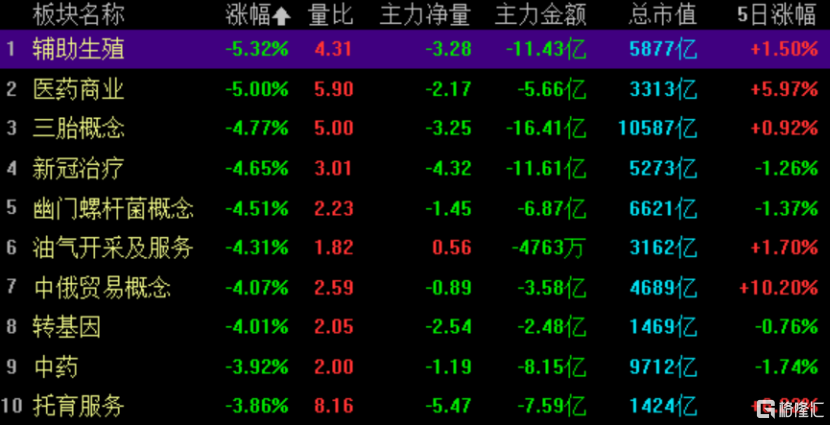 早盘,辅助生殖、新冠特效药概念跌幅居前,前期中俄受益板块全面熄火,成长板块中的锂电池、锂矿低开低走,而金属镍板块逆势走强。