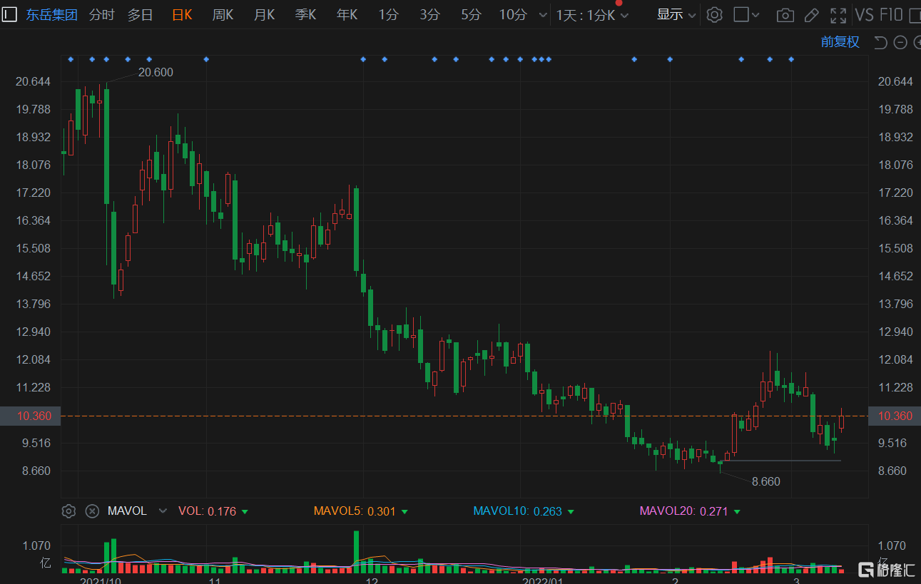 格隆汇3月10日丨东岳集团(0189.HK)反弹7.36%,报10.36港元,暂成交1.81亿港元,总市值233.5亿港元。瑞银首予东岳集团“买入”评级,目标价14港元,认为股价自2021年9月起调整超过60%,公司被低估。市场忽略了其收益结构的潜在改善。另外,沪港通下的港股通股票名单发生调整,东岳集团已于3月7日起获纳入。