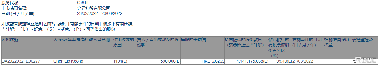 金界控股(03918.HK)获Chen Lip Keong增持59万股