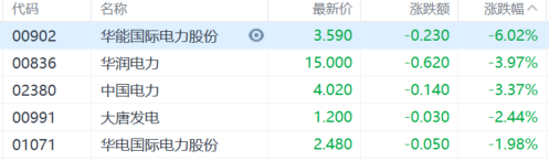 电力股全线下挫。华能国际电力绩后收跌逾6%,华润电力、中国电力跌超3%,大唐发电、华电国际电力股份跟的。消息面上,华能国际电力股份公布2021年度业绩,营业收入2,046.05亿人民币(下同),按年增加20.7%。录得亏损106.36亿元,相对上一年度纯利23.78亿元,盈转亏;每股亏损81分。不派息。