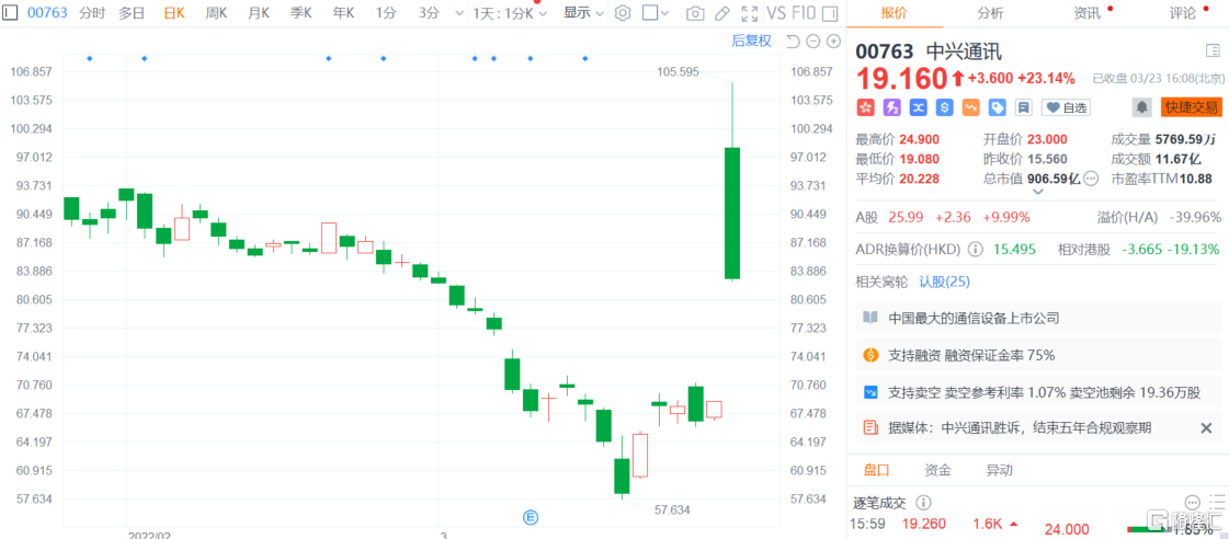 个股方面,中兴通讯暴涨60%报24.9港元。中兴通讯午间发布公告称,公司于2022年3月22日(美国时间)收到法院判决,裁定不予撤销中兴通讯的缓刑期(即缓刑期将于原定的2022年3月22日届满)且不附加任何处罚,并确认监察官任期将于原定的2022年3月22日(美国时间)结束。