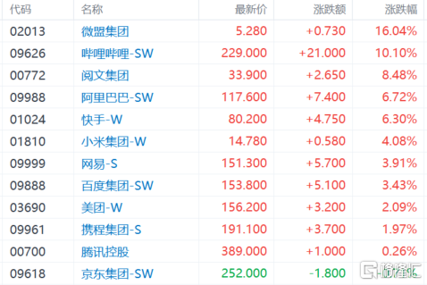 科技股集体大涨。微盟集团涨超16%,哔哩哔哩涨超10%,快手、阿里涨超6%,小米、百度、美团、腾讯等跟涨,京东尾盘转跌。消息面上,昨日阿里、小米宣布大规模回购,市场料或将开启新一轮中概股回购热潮。此外,小米昨晚公布业绩显示,Q4营收855.75亿元,同比增21.4%,腾讯也将于今日盘后公布业绩。