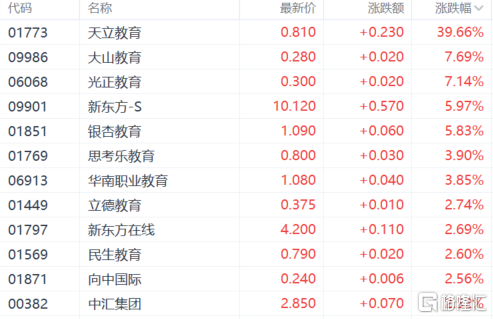 教育股普涨,天立教育涨超39%,大山教育、光正教育涨超7%,新东方涨超5%,思考乐教育涨超3%。消息面上,教育部等部门印发《关于实施百万就业见习岗位募集计划的通知》,启动实施百万就业见习岗位募集计划,进一步推进就业见习工作。