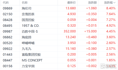 港股餐饮股走强,海伦司涨超8%,奈雪的茶、国贸控股涨超7%,海底捞涨、呷哺呷哺、海伦司、九毛九跟涨。