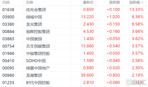 内房股大涨。佳兆业集团涨潮13%,绿城中国涨超8%,龙光集团、旭辉控股、绿景中国等跟涨。消息面上,哈尔滨废止了《哈尔滨市人民政府办公厅关于进一步加强房地产市场调控工作的通知》,取消了区域性限售政策。