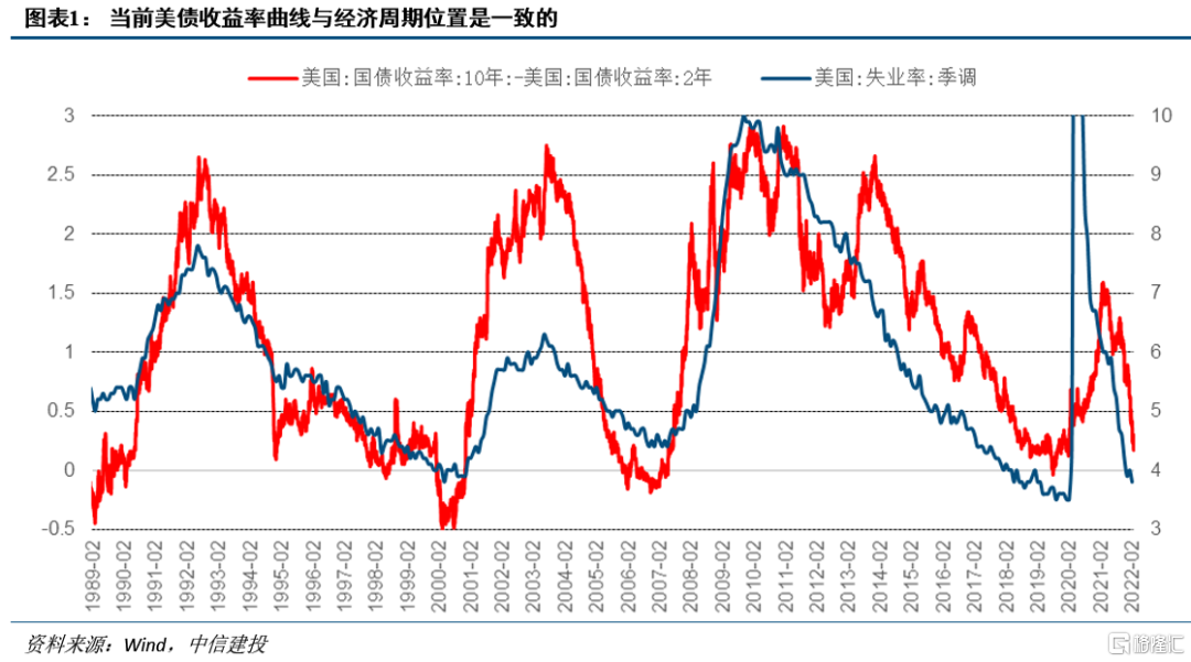 由于本轮经济周期比正常周期更快,价格预期、经济预期都呈现“近端强,远端弱”的形态,但名义利率是名义经济的映射,不用太过于纠结曲线倒挂是因为通胀预期还是实际利率。从周期位置来看,无论是失业率还是产出缺口都显示经济已经到了周期末期的状态,周期之末曲线极度平坦化才是正常现象,既然期限利差和失业率都已经基本回归疫情前水平,那么可以说当前美债收益率曲线与经济周期位置是相匹配的,这次没什么不一样。