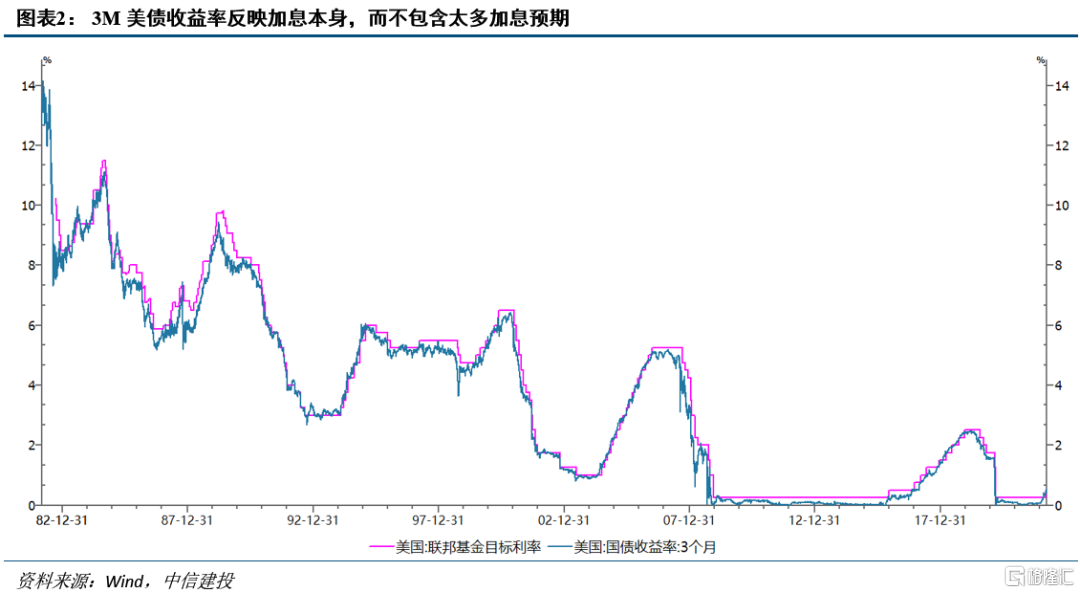 由于3个月美债收益率的期限无法横跨一个完整的加息周期,其更多时候是滞后变量,反映加息的事实而非预期。之所以10Y-3M利差还很充裕,是因为美联储在经济末期才刚开始加息,即事实滞后于预期太多,因此10Y-3M曲线已经处于严重失真状态,我们认为更应该关注1年期以上的各个收益率曲线。