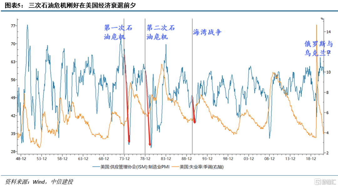 除开曲线倒挂,未来美国经济衰退风险有一些其它迹象:(1)美国周期末期往往对应中波衰退,历史上三次石油危机都发生在美国失业率周期低点与PMI高点附近,随后美国经济很快出现衰退,俄乌冲突显著升级很可能再次成为美国衰退的预兆。(2)历史上,PMI物价指数达到92.1%都预示着未来经济衰退风险,反映的是涨价在后期对需求的反噬。(3)这轮库存周期下行期有第三库存周期的特点,先行指标显示美国经济将从高位显著放缓。(4)历史上油价在高位出现高波动率上涨,无一例外都预示着美国经济衰退。