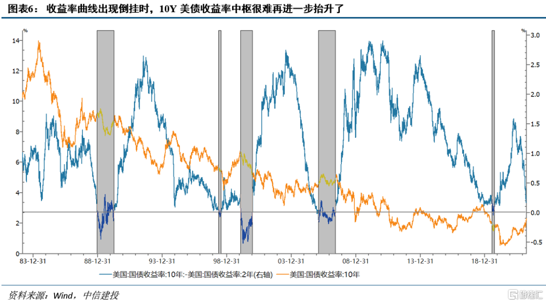 收益率曲线倒挂对资产价格的主要传导途径在于:(1)衰退预期升温。(2)历史上曲线倒挂后,过强的加息预期会降温。因此,历史上收益率曲线出现倒挂时,10Y美债收益率中枢很难再进一步抬升了,往往会出现黄金比较好的中期买点,例如2018年底部分收益率曲线开始倒挂,2019年美联储全面转鸽,黄金大涨18%。2019年底收益率曲线在此倒挂,2020年黄金创历史新高。