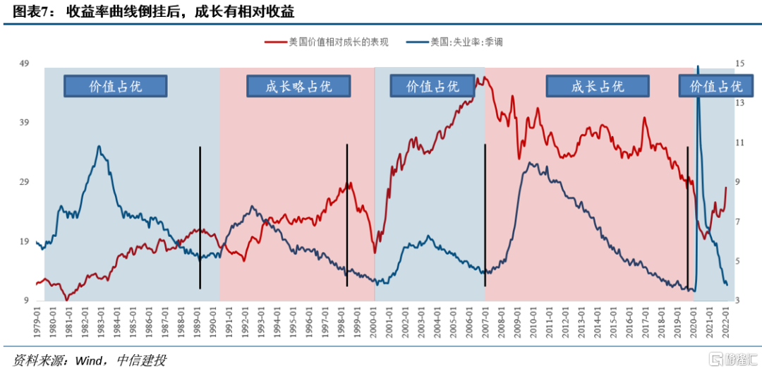 对权益市场而言,收益率曲线倒挂更多的意义是相对收益层面。风格切换的背后是产业逻辑,这与中周期(产能周期)的逻辑一致,新一轮产业转移往往在主导国中周期衰退后启动,美股一轮完整的中周期结束对应美股风格切换。以美国失业率低点为划分,1980年以来美国经历4轮完整的中周期,而每一轮中周期刚好对应成长、价值交替领跑。收益率曲线和失业率一样都属于中周期范畴指标,历史上,即便在价值风格占优的周期里,收益率曲线出现倒挂后,对应成长风格中期跑赢。
