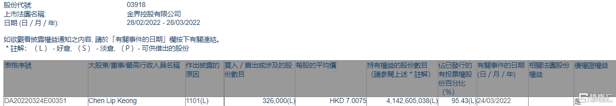 金界控股(03918.HK)获Chen Lip Keong增持32.6万股