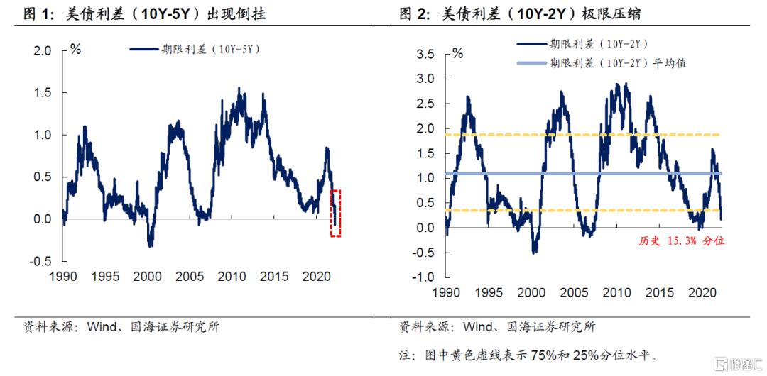 理论上来说,当市场预期未来经济出现衰退,长短端利率都会出现一定程度的下行。具体来看,长端利率会因为长期经济增长预期的下降而出现下行,与此同时,短端利率同样会出现一定幅度的下行,反应的是市场对未来美联储货币政策应对衰退进行宽松的预期。整体上,长端较短端下行幅度更大,因此,会表现出期限利差“压缩”甚至“倒挂”的现象。