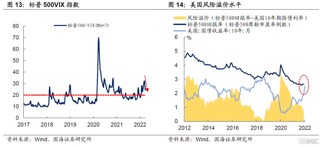 与此同时,在经历了2月底俄乌冲突的爆发后,市场已经基本消化了地缘冲突带来的冲击,美股出现一定的反弹,目前估值又重新回到了相对较高的位置。在此格局下,下阶段美债利率可能存在的继续上行,叠加5月份美联储可能开启“缩表”操作,将会使得美股的风险溢价受到明显挤压,进而出现一定的回调风险。