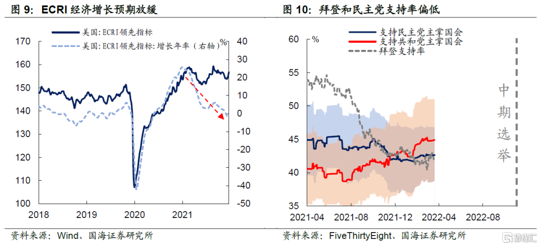 与此同时,随着今年下半年“中期选举”的临近,“通胀议题”将毫无疑问地成为美国两党博弈的重要战场,目前拜登和民主党的支持率均偏低,中期选举压力较大,下阶段两党博弈将倒逼民主党更加坚决地控制“通胀”,从而向美联储进行施压。因此,我们认为,下阶段美联储加息将“宜快不宜慢”。