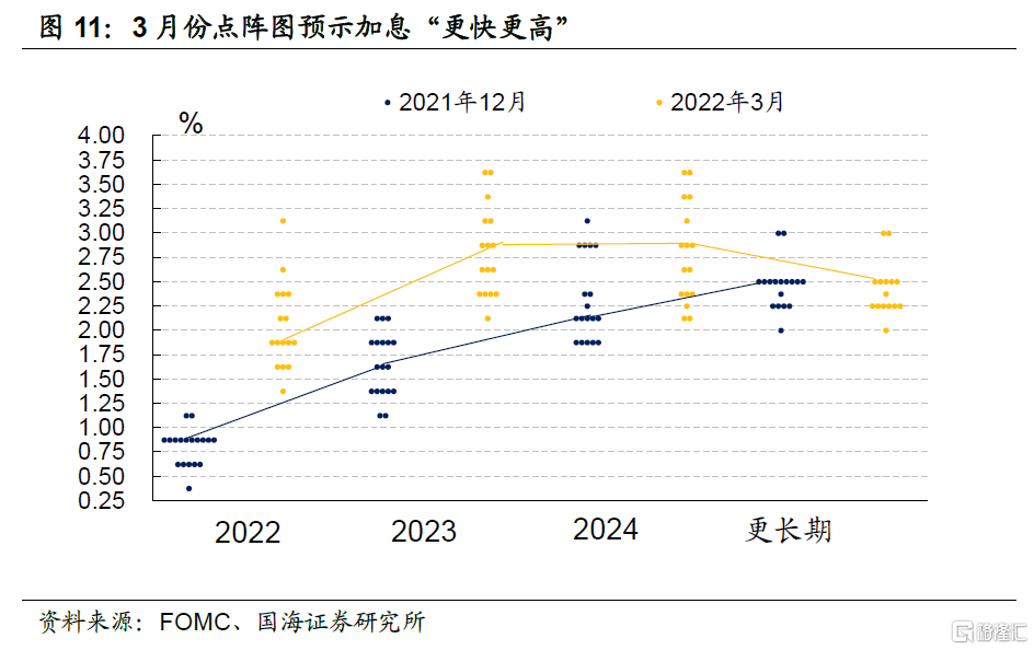 那么,美联储未来加息将会有多快?从3月份议息会议公布的加息点阵图来看,联储官员对本轮(2024年前)加息的上限预期由12月份时的2.00%-2.25%上修至2.75%-3.00%。与此同时,联储官员对2022年全年的加息预期也从75-100BP次上修至175-200BP次,显著快于12月份时期。