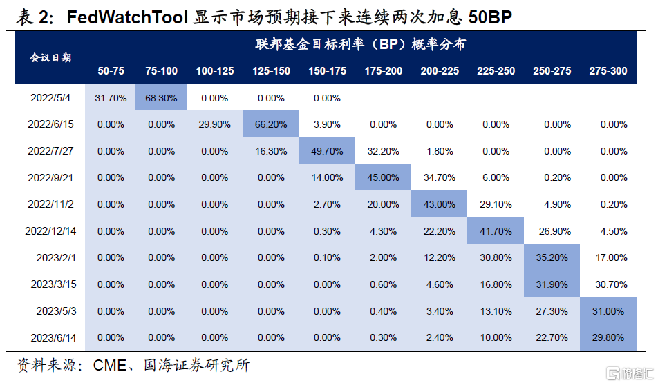 进一步,从CME的FedWatchTool来看,目前市场预期中暗含了美联储分别在5月份以及6月份的议息会议上分别进行一次性加息50BP的预期。换言之,市场预期美联储将在今年6月份时,把联邦基金目标利率提升至1.25%-1.50%。