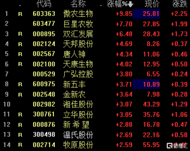 格隆汇3月29日丨傲农生物逼近涨停,巨星农牧涨7.7%,双汇发展涨6.48%,新希望涨近3%,牧原股份涨2.59%。