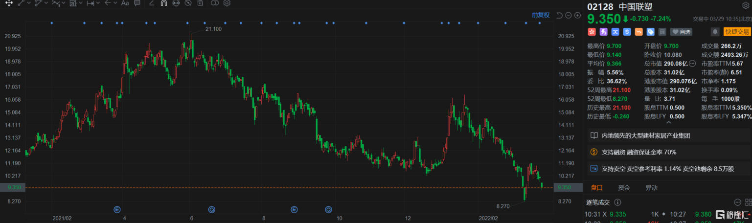 格隆汇3月29日丨中国联塑(2128.HK)跌7.24%,报9.35港元,总市值290亿港元。该公司昨日发布财报,发布截至2021年12月31日止年度业绩,收入320.58亿元,同比增加14.2%;股东应占溢利30.44亿元,同比下降18.8%;每股基本盈利0.99元,拟派末期股息每股26港仙。