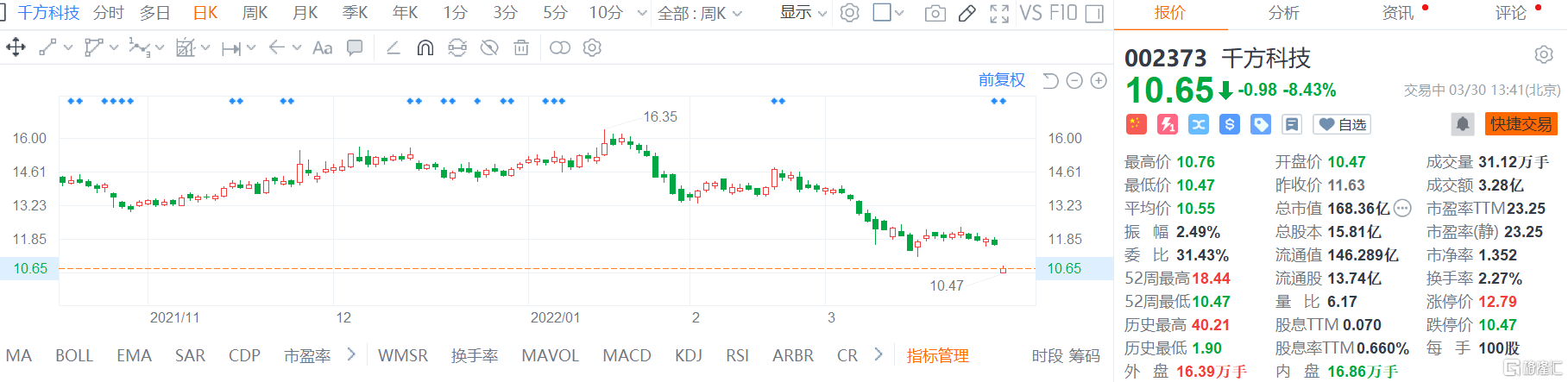 格隆汇3月30日丨千方科技(002373.SZ)早间以跌停价开盘,随后维持在低位震荡,现报10.65元,跌幅8.4%,总市值168.4亿。公司29日公告称,2021年营业收入102.81亿元,同比增长9.15%;归属于上市公司股东的净利润7.24亿元,同比下降33.01%。预计2022年一季度归属于上市公司股东的净利润为亏损2.4亿元-2.9亿元,上年同期为盈利1.40亿元。
