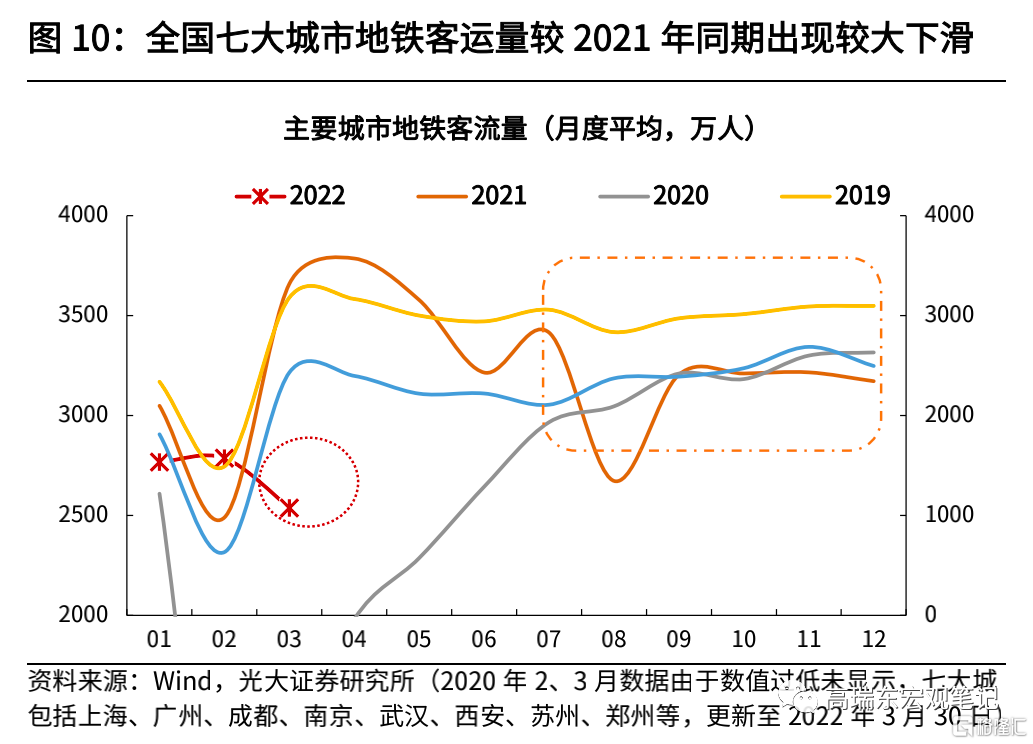 在各地较为严格的疫情防控要求下,市内和跨区域人员流动明显下降,全国百城拥堵指数、城市地铁客运量均出现较大下滑。截至3月30日,与2019年同期比,全国七大城市3月地铁客运量下滑29.3%,其中上海降幅超过50%,南京、苏州地铁客运量降幅分别为48.4%、33.6%。