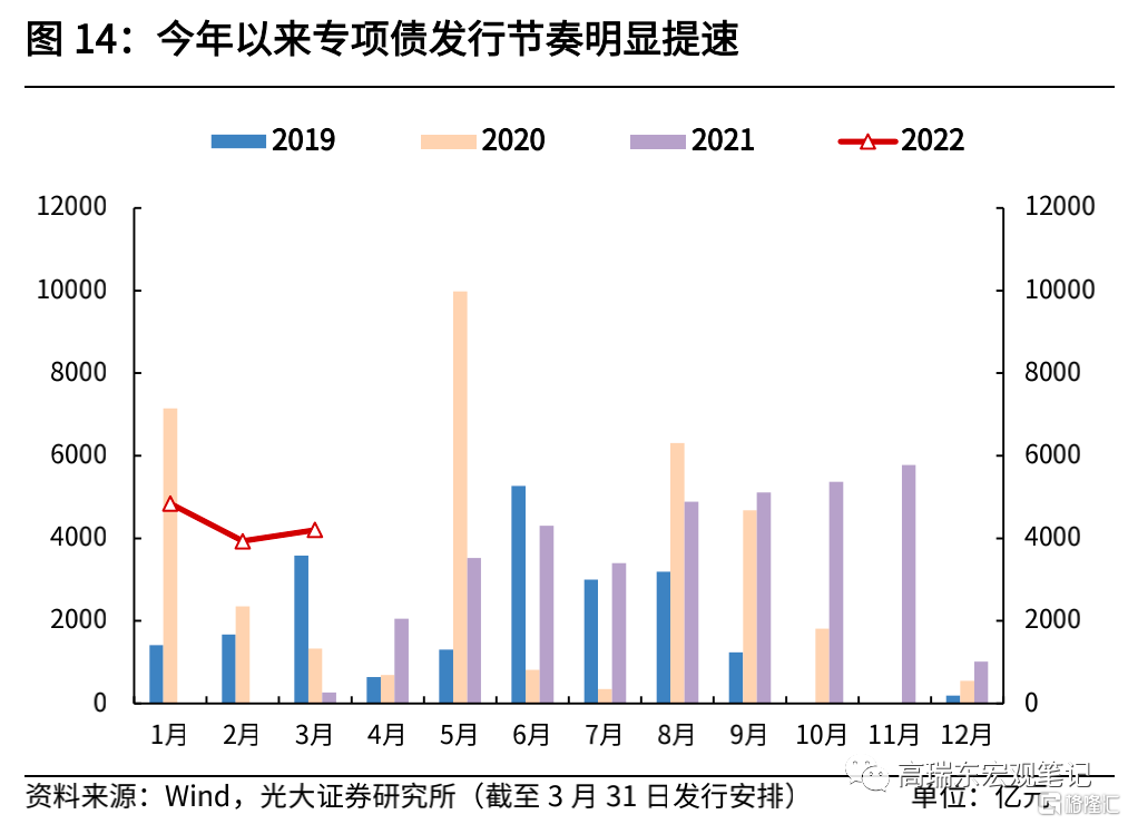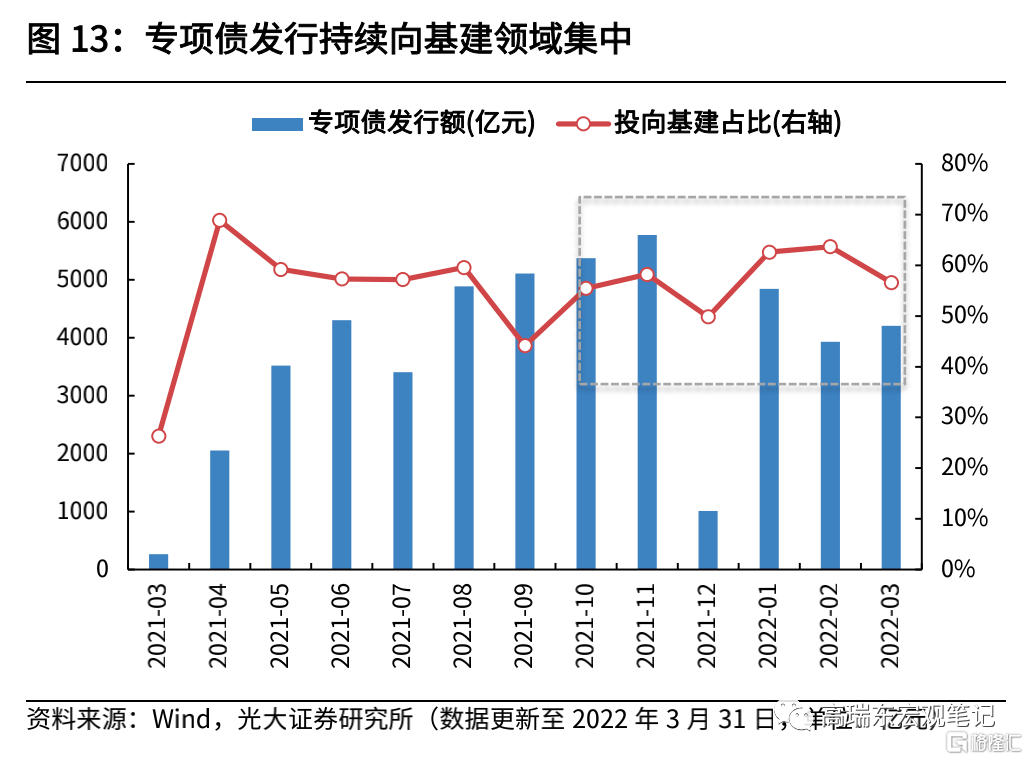 今年以来,政策持续聚焦重大项目开工与建设,保障重大项目早下达、早开工、早见效,专项债发行持续提速,助力基建稳增长。2022年1-3月,全国共计新增专项债12980亿,占到提前批额度(1.46万亿)的89%,发行节奏明显提速。从投向来看,专项债发行向基建领域持续加码。1-3月专项债投向基建领域的资金达7088亿,占比61%,相比2021年四季度的56%显著提升。