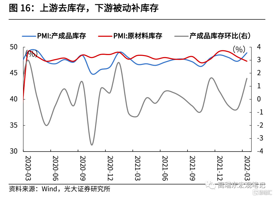从库存指数来看,上游去库存,下游被动补库存。3月产成品库存PMI为48.9%,比上月上升1.6个百分点;原材料库存PMI较上月回落0.8个百分点,上游市场需求旺盛,下游需求有所放缓,产成品库存再次被动上升。