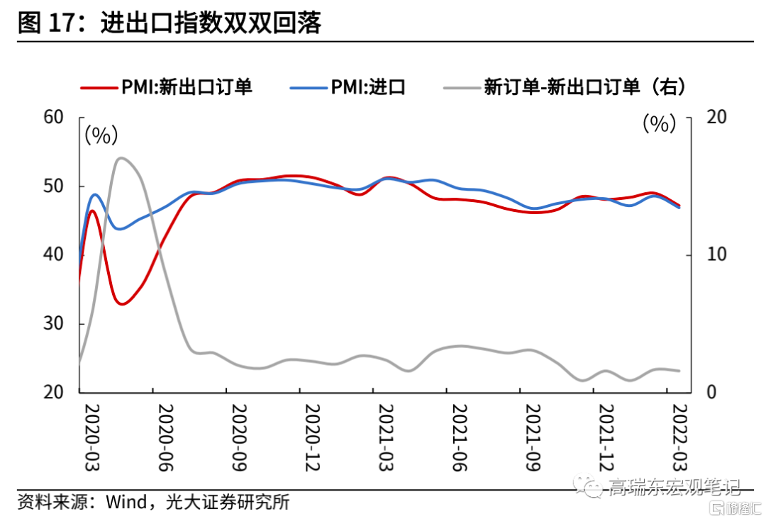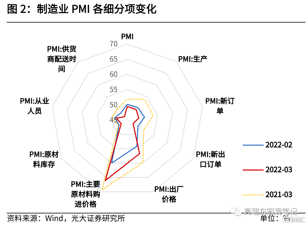 3月以来,国内多地出现聚集性疫情,企业生产经营活动受到影响,制造业PMI明显回落。一则,受疫情影响,局部地区部分企业临时减产停产;二则,新订单指数大幅回落,内外需求均有所减弱;三则,物流运输不畅,供应交货时间延长;四则,原材料采购成本不断增加,给中下游行业带来较大成本压力。