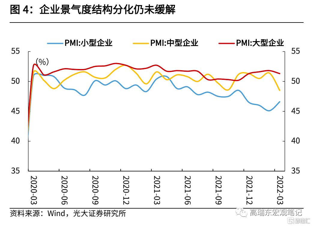 一则,大小企业结构分化状况仍未缓解。3月大型企业PMI为51.3%,低于上月0.5个百分点,但高于制造业总体1.8个百分点,运行相对稳定;而3月中型企业PMI为48.5%,低于上月2.9个百分点,降至收缩区间。小型企业PMI为46.6%,继续位于临界点以下,大小企业结构分化状况仍未缓解。