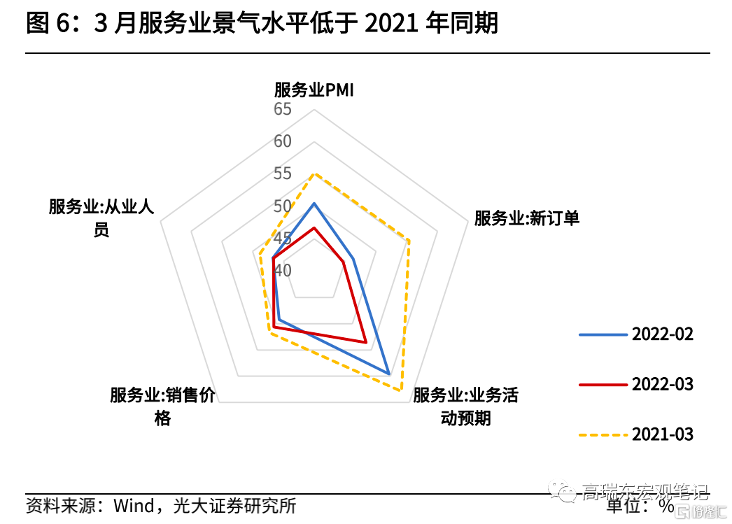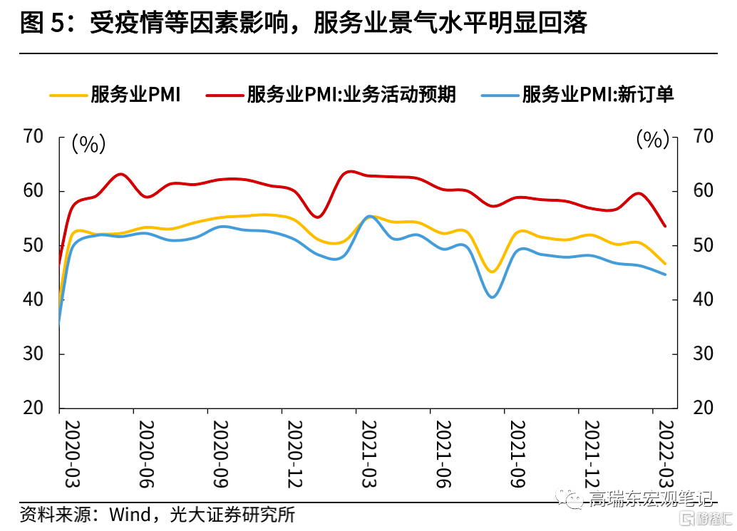 受疫情等因素影响,服务业景气水平明显回落。3月服务业PMI为46.7%,比上月回落3.8个百分点,比上年同期回落8.5个百分点,服务业市场活动放缓。