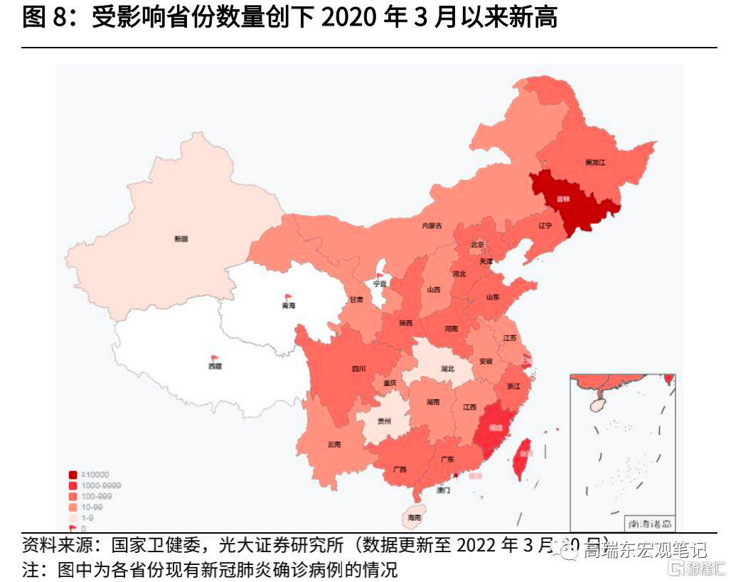 从受影响省份来看,本轮疫情波及的省份数量和所涉及的经济体量,均创下了2020年3月以来的新高,其中吉林、上海等地疫情防控局势较为严峻,截至3月30日,累计新增阳性感染者数量已破万。