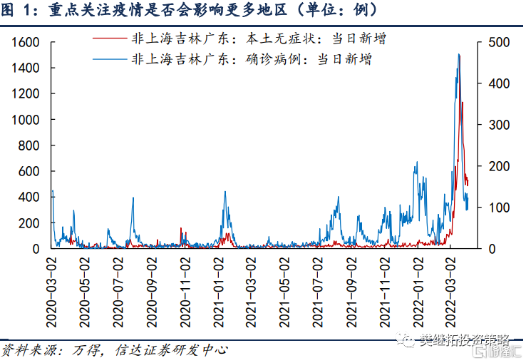 (1)疫情是否會擴散決定了這一次疫情衝擊持續的時間。隨着上海和吉林疫情形勢的嚴峻,短期來看,疫情會是A股重要的影響變量。我們認爲,疫情對上海和吉林短期經濟產生負面衝擊已經是確定的了,而且股市已經定價充分,後續的重點是這一影響是否會擴散。從近期的數據來看,目前剔除上海、吉林和廣東後的疫情數據雖然相比前兩年有所增加,但依然可控,特別是3月下旬以來,有所下降。所以,只要其他地區沒有出現快速增加,我們依然可以認爲這是一次階段性的衝擊,影響時間在季度以內。