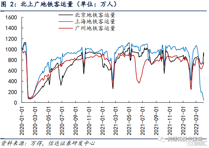(2)對經濟衝擊剛開始出現。隨着上海的疫情管控的加強,對經濟的衝擊將會逐步顯現,上海地鐵客運量已經降低到2020年春節後的低點。