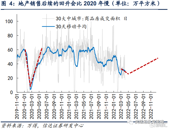 由於疫情短期影響沒有2020年大,所以博弈類似2020年4-7月經濟的V型復甦難度會更大。以地產銷售數據爲例,2020年Q1由於疫情和春節的影響,30個大中城市商品房銷售面積由60萬平方米大幅下降到接近0,隨後在兩個季度內快速回升到疫情前的水平。如此劇烈波動,雖然很多隻是環比的變化,但由於波動大,也是很有投資價值的。但是這一次房地產銷售下降始於2021年Q3,疫情帶來的衝擊並不是最主要的影響,所以疫情後的數據恢復不可能像2020年那麼快。重點需要觀察穩增長對長期預期的改變,而不是疫情對短期環比數據的影響。