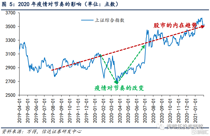 (3)疫情對股市節奏影響推演。基於以上的分析,我們可以確定的是,只要疫情沒有繼續快速擴散到更多城市,疫情對經濟短期的影響遠小於2020年Q1。回顧2020年,能夠發現,不管是在中國還是全球,疫情雖然改變了很多長期的經濟趨勢,但並沒有改變始於2019年的全球陸續出現的新一輪景氣週期。疫情對全球經濟產生了巨大的短期衝擊,但也只是讓A股市場整體偏離內在趨勢2個季度。