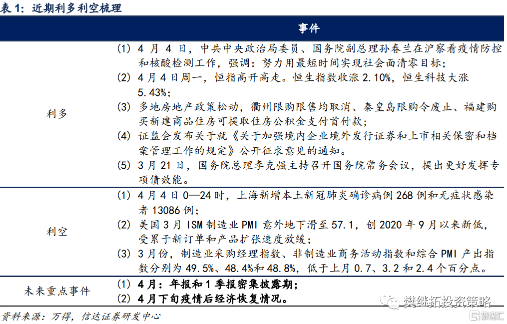 近期的疫情形勢,已經對短期經濟產生了負面影響,部分投資者正在按照2020年的經驗調整倉位和板塊。我們認爲,這一次的疫情衝擊相比2020年,有兩點不同:(1)影響範圍更小;(2)股市內在趨勢不同。2020年,股市的內在趨勢是牛市,疫情雖然對經濟衝擊很大,但也只是讓A股市場整體偏離內在趨勢2個季度。2022年,股市的內在趨勢是V型大震盪,近期的疫情,加劇了3月上旬的調整幅度,也帶來了更快的穩增長政策,對季度內的市場會有影響,但不改變2022年V型大震盪的內在趨勢。3月中旬以來,市場反彈核心驅動力是“超跌反彈+政策穩定預期+季報前後估值和業績匹配度再修正”,反彈能持續到4月中。