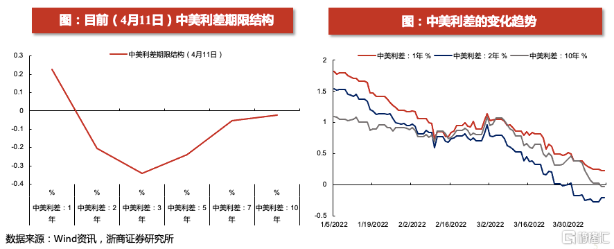 近期各期限中美利差呈现持续倒挂的趋势。目前(4月11日) 2 年期、3年期、5年期、7年期和10年期中美利差分别倒挂21bp、34bp、24bp、5bp和2bp。4月11日,10年期中美利差首次出现倒挂,成为市场关注的焦点。债券短端利率很大程度上受到央行政策利率或政策利率预期的影响,而债券长端利率更多反映的是中长期经济、通胀、货币政策的走势和变化。中美中长期利差倒挂核心反映的是中美两国经济基本面的背离。