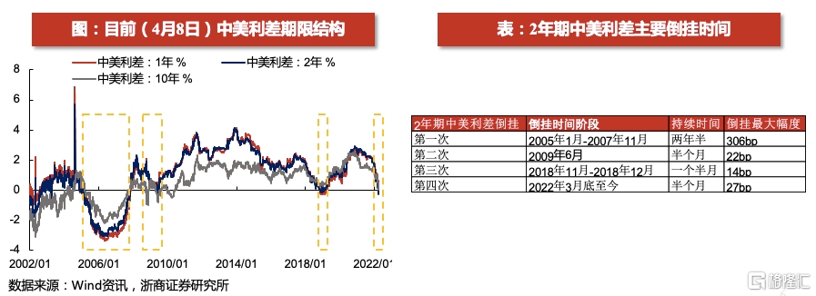 回顾过去二十年中美利差曾经出现三次倒挂,背后原因主要是中美经济一定程度上的错位和背离。