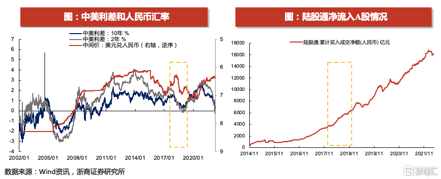 就北上资金来看,中美利差收窄至倒挂的阶段,外资通过陆股通净流入A股的趋势并未改变。具体来看,2017年中至2019年初这段时间内,中美利差快速收窄至倒挂,人民币先升值后贬值,但北上资金整体并未受到任何影响,呈现加速流入A股的态势。