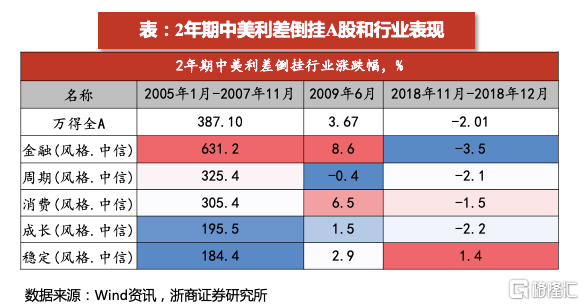 风格来看,三轮中美利差倒挂,涨幅居前的行业与当时的宏观背景和产业周期有关。2005年1月-2007年11月,重工业腾飞带动经济增长,金融周期在中美利差倒挂期间明显跑赢;2009年6月,金融危机后财政刺激叠加产业扶持政策推出,金融消费在中美利差倒挂期间明显跑赢;2018年11月-12月,中美贸易战叠加金融去杠杆,股市调整,具有防御属性的稳定和消费在中美利差倒挂期间明显跑赢。
