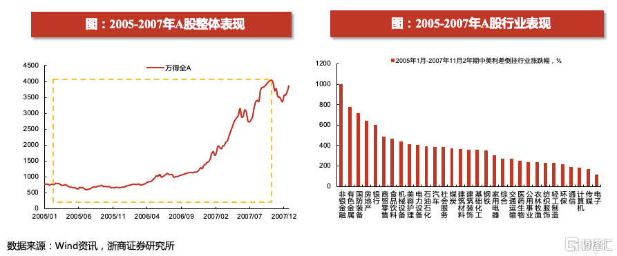 A股在这一轮中美利差倒挂的阶段中,走出了较强的上涨行情。这一轮中美利差倒挂,本质上是由于美国进入货币政策大幅收紧的阶段(3年加息17次),导致美债收益率快速上升。当时国内经济维持10%以上高速增长,但边际上有所回落,因此国债收益率与美债收益率相反,处于下行阶段。A股在2005年1月-2007年11月走出了一轮大幅上涨的行情。